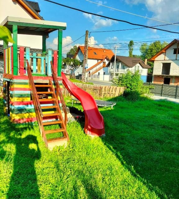 Camerele se afla la parterul casei ,au baie proprie,intrare din exteriorul si au o capacitate de 4 adulti sau 4 adulti cu doi copii,sunt orientate cu privelistea spre varful Pietrosul iar in curte gasiti un spatiu generos de joaca pentru copii,avand trambulina,topogan,casute.Accesul este din soseaua nationala DN 18