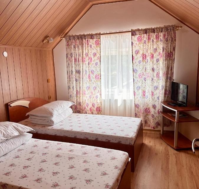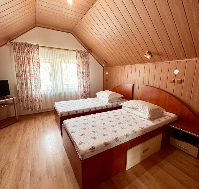 Dispune de 4 camere duble matrimoniale cu baie proprie, iar la mansarda, 2 camere duble cu paturi twin si aer conditionat, cu baie comuna.