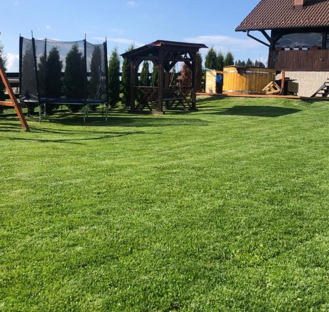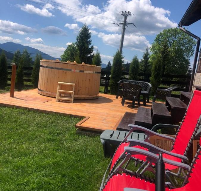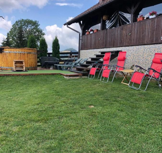 Afara se afla o terasa mare cu loc pentru servit masa, ceaun, gratar, lemne, trambulina, leagan pentru copii.