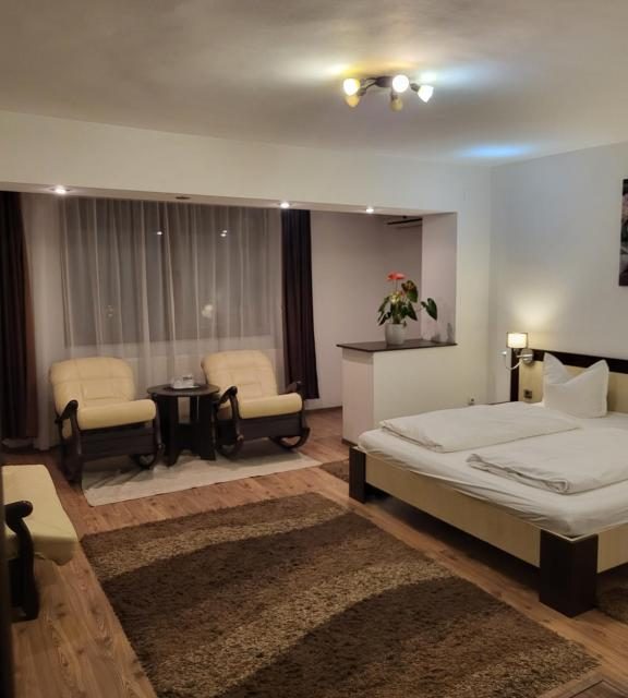 Va stam la dispozitie cu 40 locuri de cazare in camere elegante, baie proprie dotate cu uscator de par, cada sau cada de dus, unele camere au balcon, televizor Lcd, acces internet wireless, parcare in curte in limita locurilor disponibile.