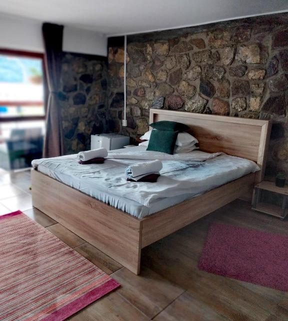 La demisol sunt doua camere, fiecare camera are pat matrimonial, camerele sunt dotate cu televizor, frigider si fiecare camera are baie proprie, cu vedere spre dunare.
