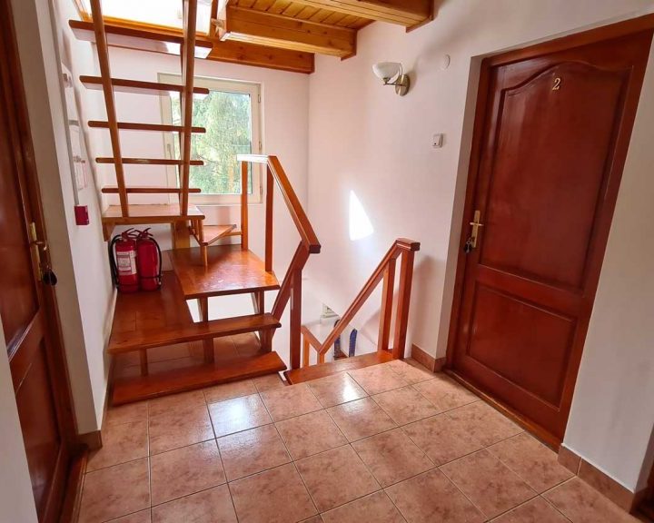 Pensiunea este clasificata la 2 stele si este construita in anul 2004, fiind dotata cu 9 dormitoare ( 8 camere cu cate 2 locuri si 1 camera cu 4 locuri), 7 bai, living, bucatarie, avand in total 20 locuri de cazare.